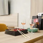 - ❓Is there a kitchen available at this apartment for guest use?Yes, this apartment is furnished with a kitchen and offers an electric kettle, a refrigerator, and kitchenware as well.